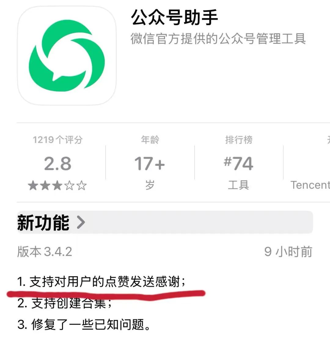 日前,“订阅号助手”App进行了新版本更新,其功能介绍中提到称:支持对用户的点赞发送感谢。