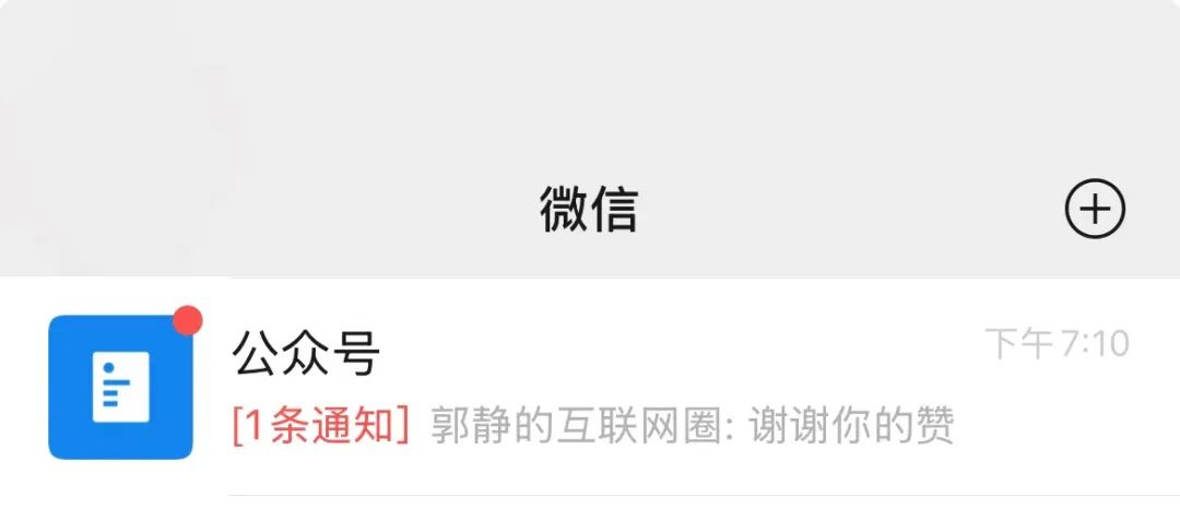 作者点击“谢谢”按钮后,用户的“公众号”主频道中会收到系统推送“1条通知”,“XXX谢谢你的赞”。